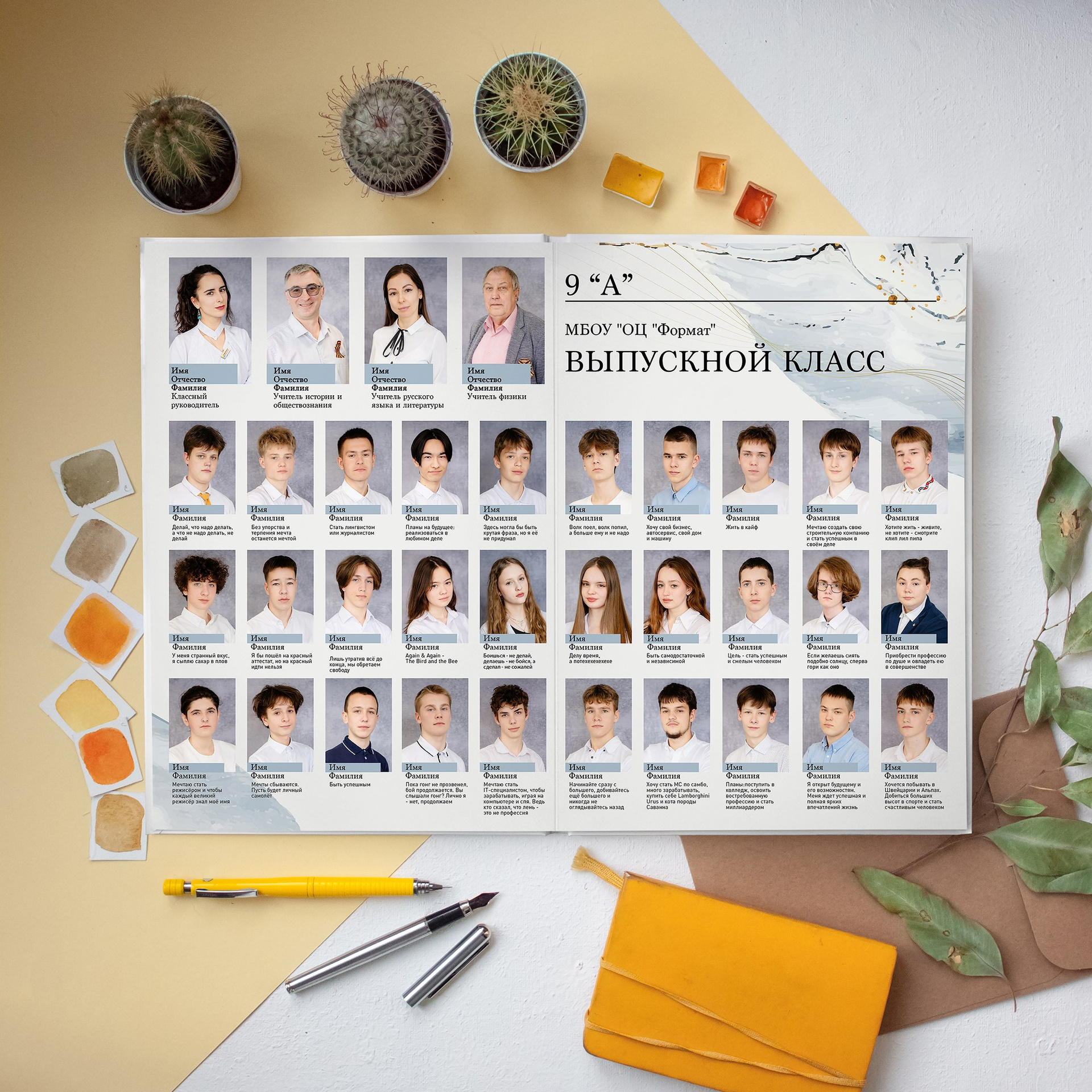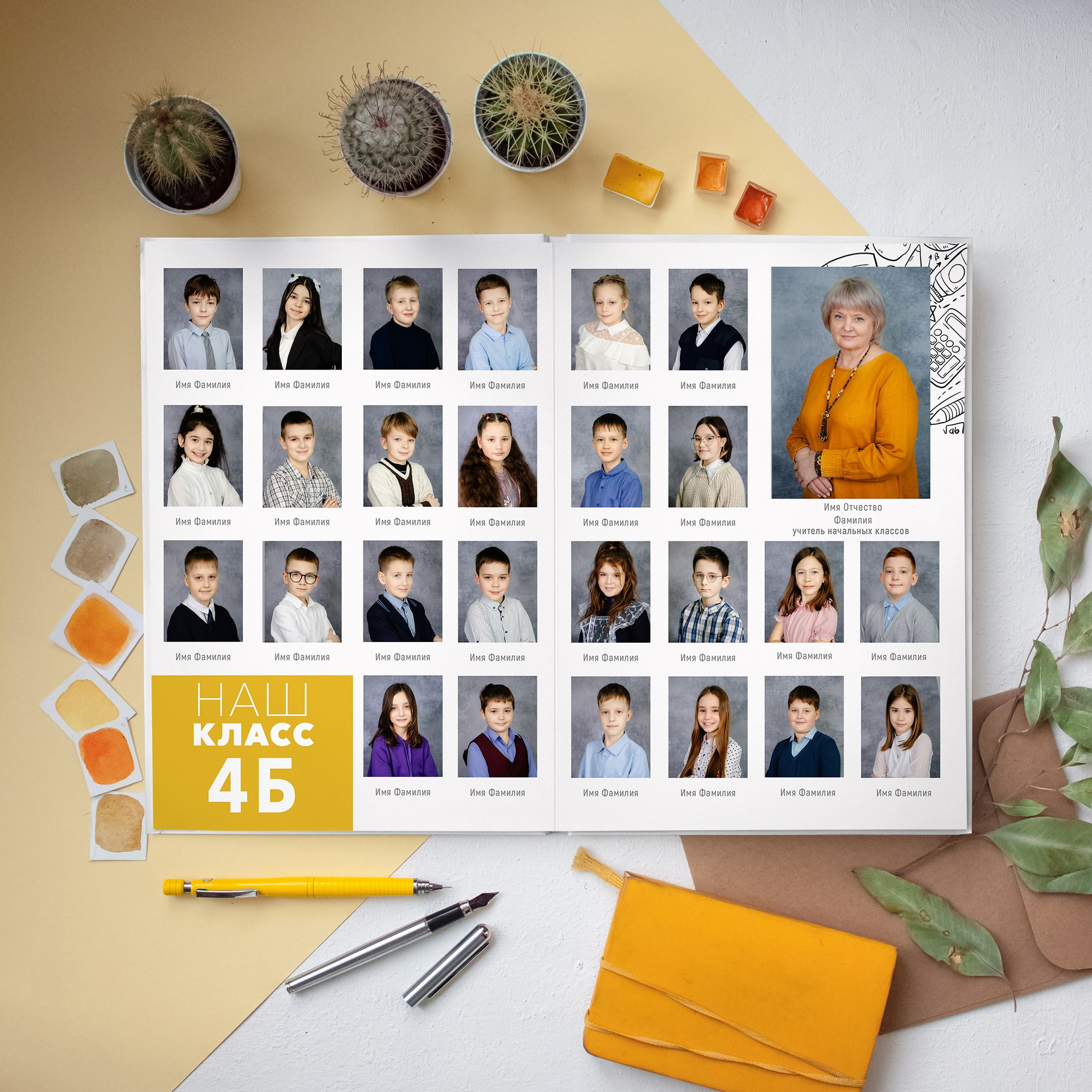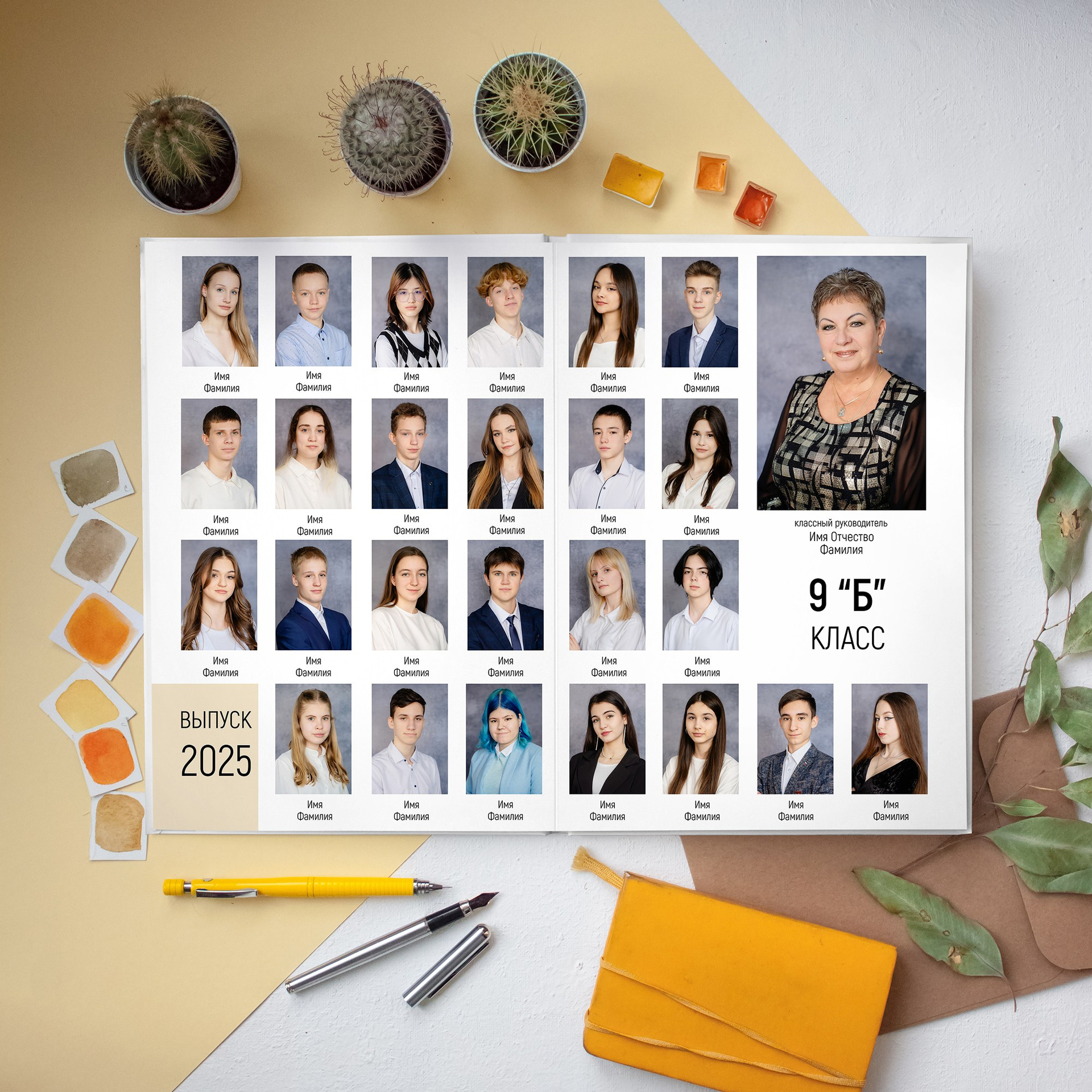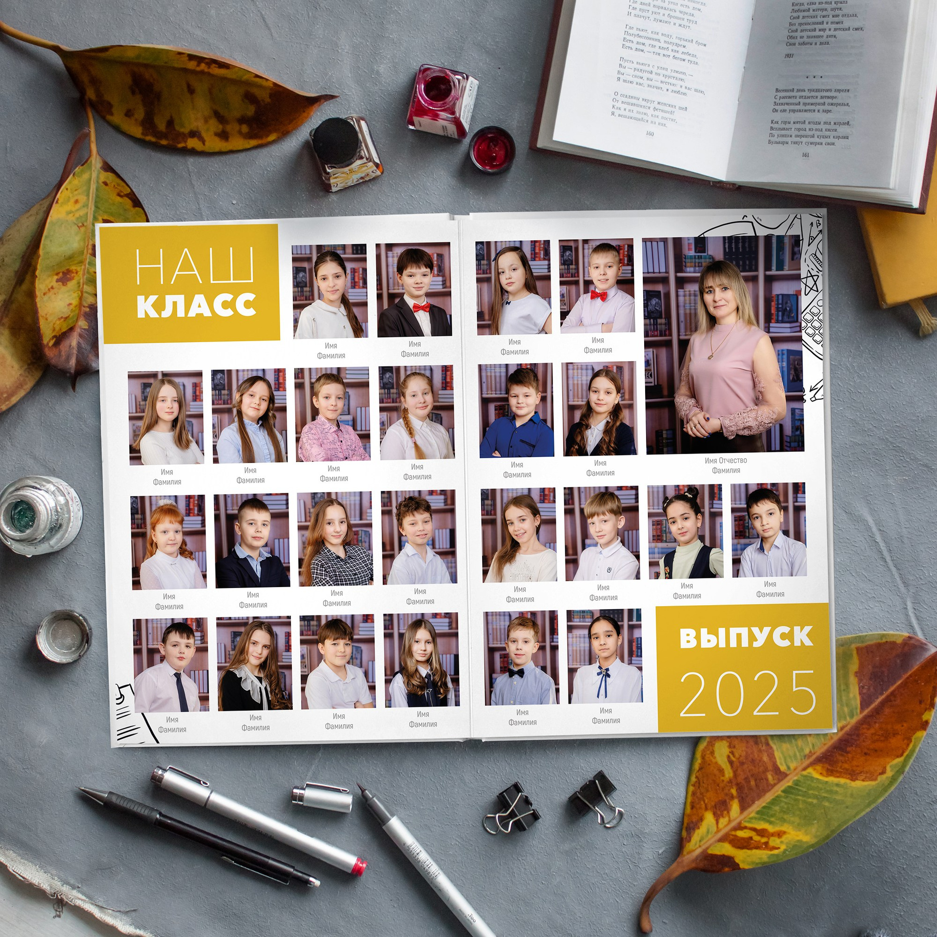 1 фотосессия в школе или на улице. Печать на фотобумаге размером 20*30см из индивидуальных портретов с Фамилией Именем каждого ученика. Добавляется текст (№ школы, класс, год, город). Дизайн выбирается один на весь класс. Досъёмка отсутствующих учеников не предусмотрена. Выбранный портрет для виньетки вы получаете также в электронном виде.