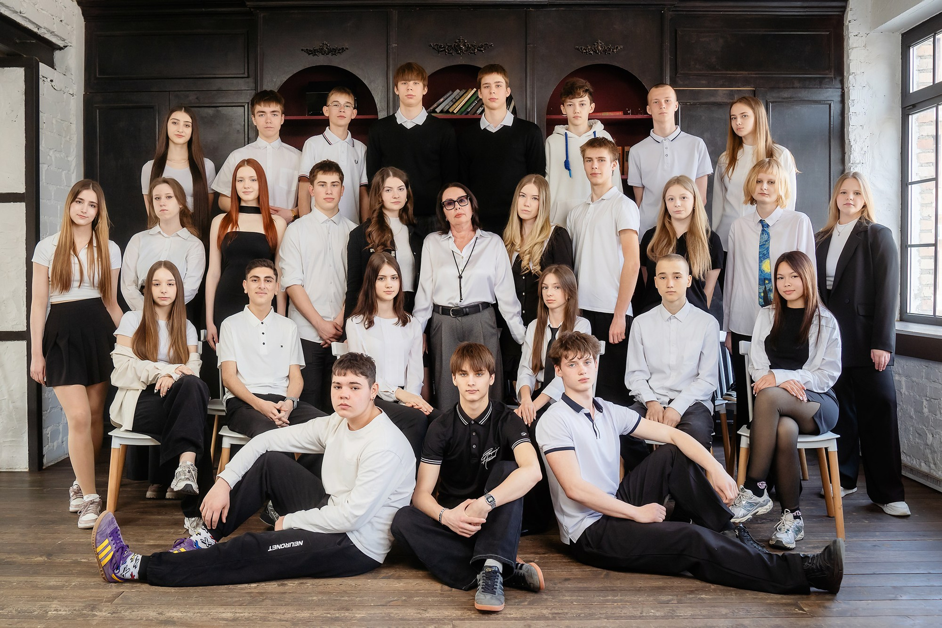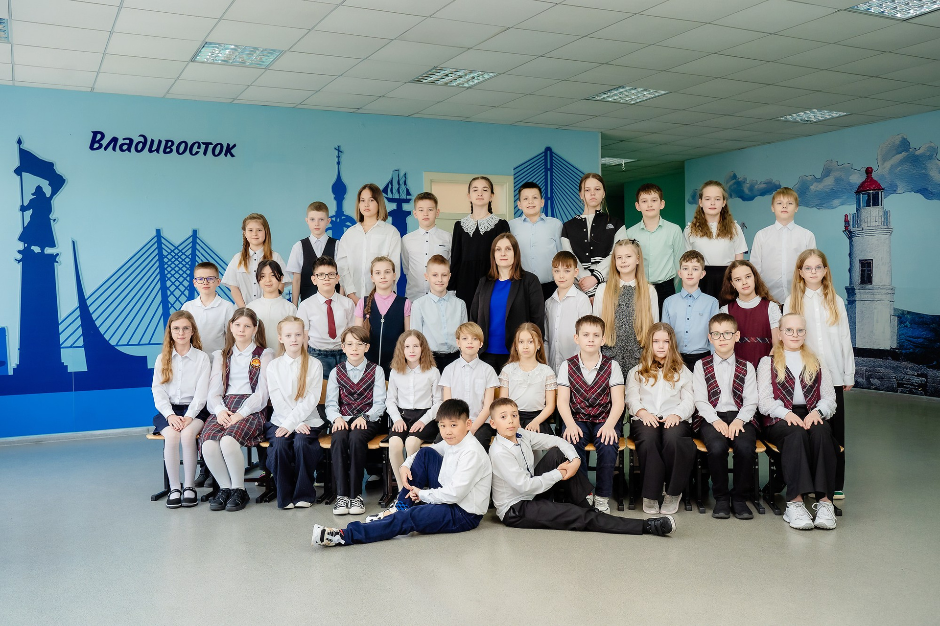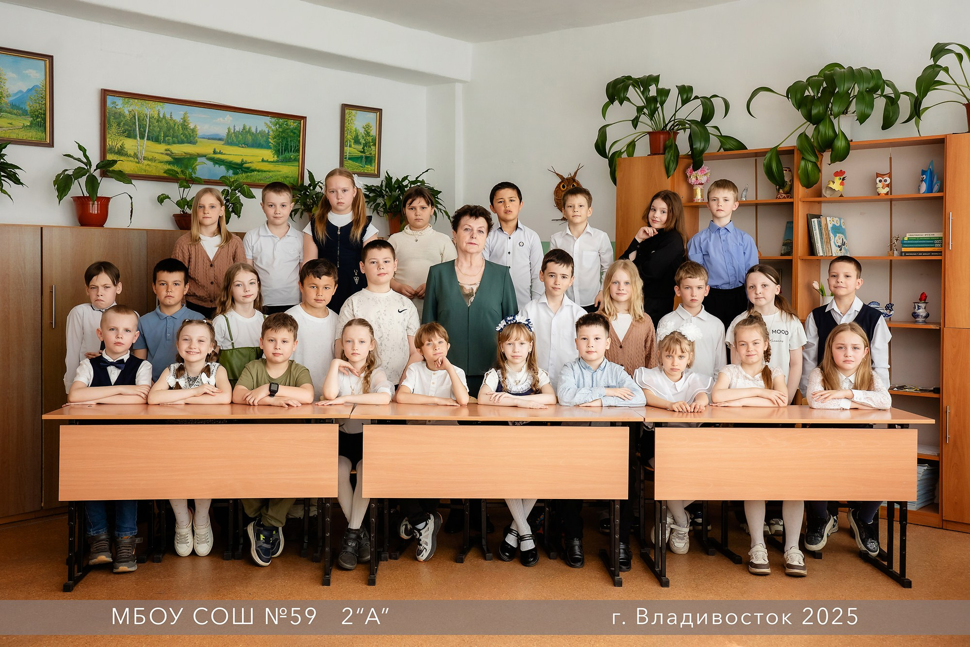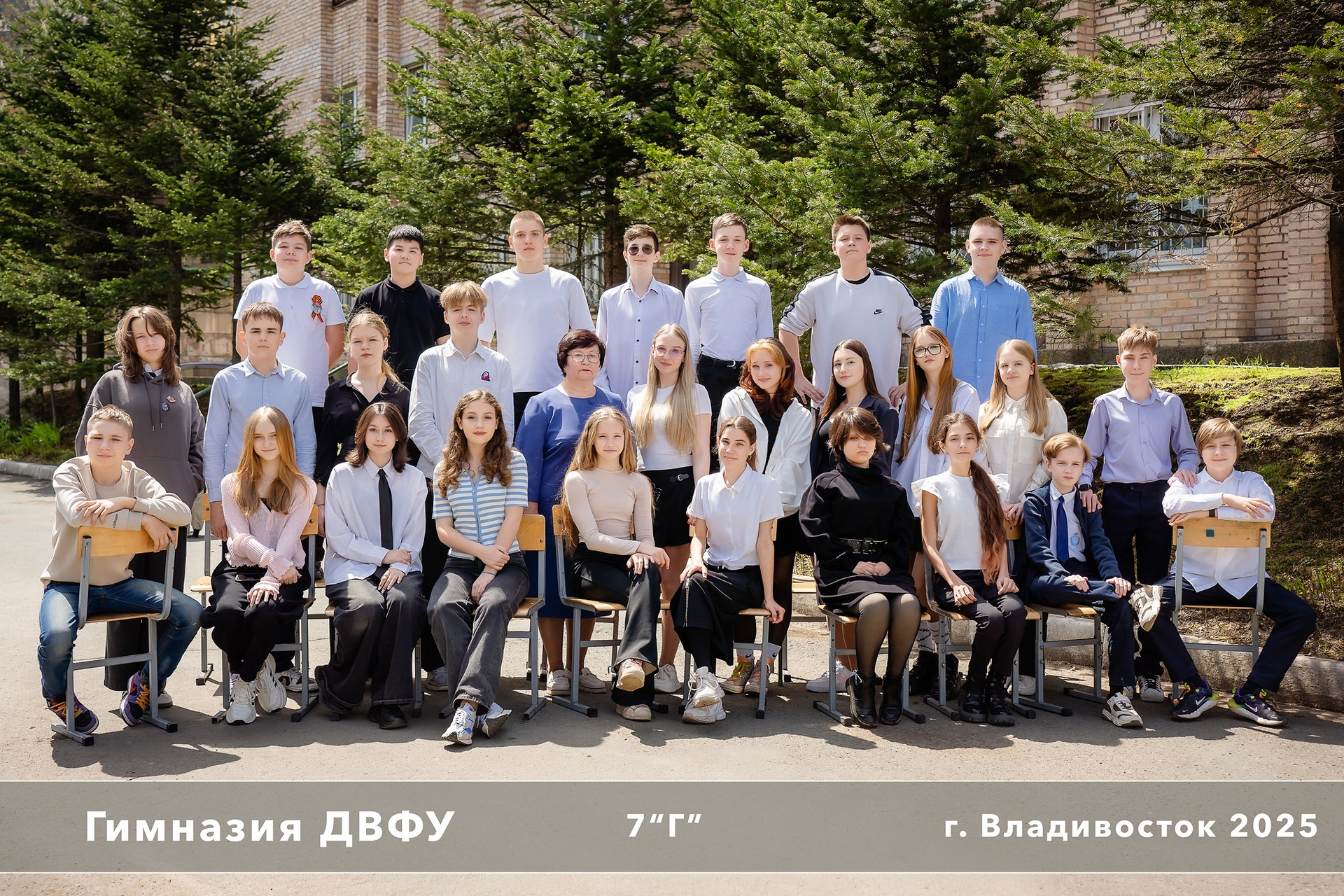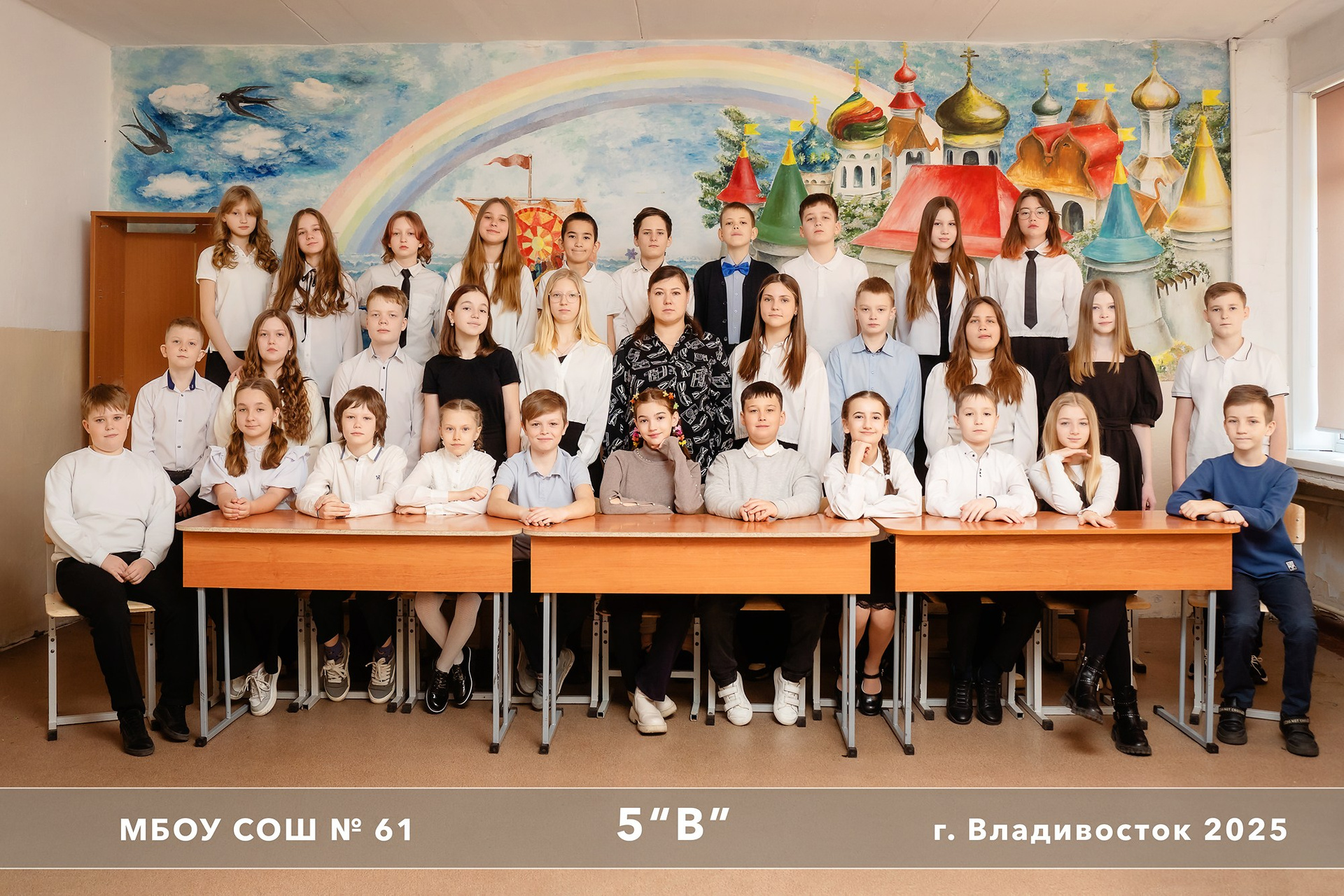 Классическая общая фотография всего класса в школе или на улице. При обработке фон НЕ меняется, звёздочки, лучики и прочее НЕ добавляется. Добавляется текст (№ школы, класс, год, город). Досъёмка отсутствующих учеников не предусмотрена.